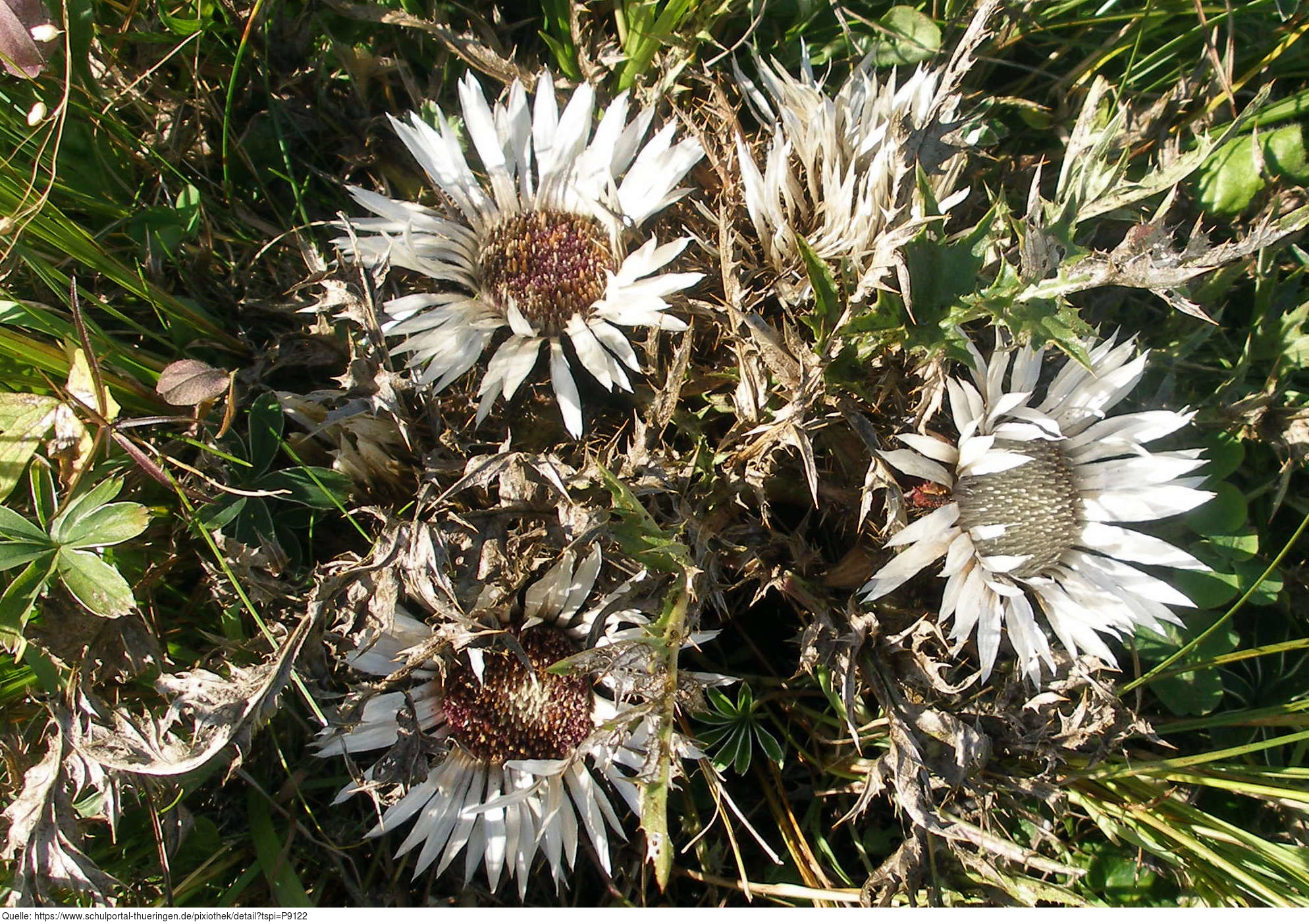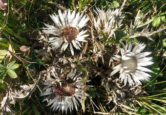 Das Foto zeigt die Blüten von Silberdisteln (Carlina acaulis). Es gelten die Nutzungsbedingungen der Mediothek und Pixiothek.