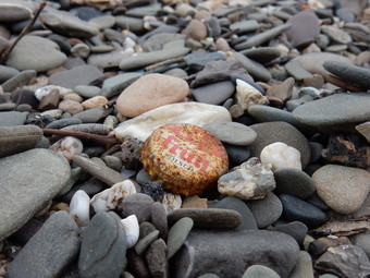 Das Bild gehört zur Serie "Strand". Es zeigt Steine am Flussufer mit verrostetem Kronkorken. Das Bild ist unter CC0 lizenziert und kann somit frei verwendet werden.