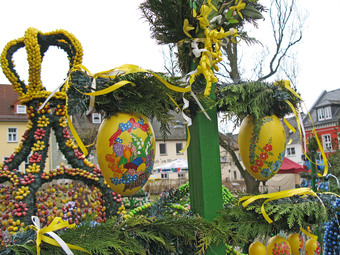 Das Foto gehört zur Serie "Ostern". Es zeigt die Osterkrone in Berga/Elster. 2015 bestand diese Dekoration aus über 15000 bemalten Eiern. Das Bild ist unter CC0 lizenziert und kann somit frei verwendet werden.
