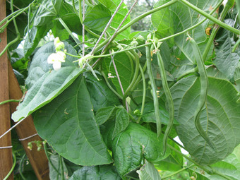 Das Foto gehört zur Serie "Gemüse". Es zeigt Pflanzen der Gartenbohne. Gartenbohnen, die unbegrenzt wachsen und sich dabei stark winden, bekommen vom Gärtner Stangen als Rankhilfen (Stangenbohnen). Das Bild ist unter CC0 lizenziert und kann somit frei verwendet werden.