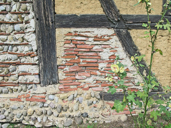 Das Foto gehört zur Serie Fachwerkhäuser. Es zeigt ein Gefach, dass mit gebrauchten Dachziegeln ausgemauert wurde. Das Gefach konnte dann noch mit Lehm beworfen werden, um eine glatte Oberfläche zu erhalten. Es gelten die Nutzungsbedingungen der Mediothek und Pixiothek.