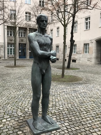 Innenhof des Bendlerblocks mit Gedenktafeln, Denkmal von Richard Scheibe 1953: Junger Mann mit gebundenen Händen. Es gelten die Nutzungsbedingungen der Mediothek und Pixiothek.