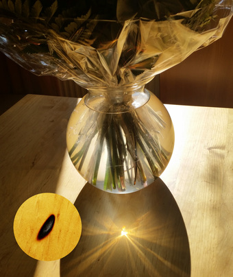 Das Bild gehört zur Serie "Optik". Es zeigt eine kugelförmige Blumenvase vor einem Fenster. Die Sonnenstrahlen werden beim Durchgang durch die mit Wasser gefüllte Vase gebrochen. Der Brennpunkt entsteht hier auf der Tischplatte. Das führte in diesem Fall zu einem angesengten Fleck. Die betreffende Stelle ist im runden Bild vergrößert dargestellt. Das Bild ist unter CC0 lizenziert und kann somit frei verwendet werden.