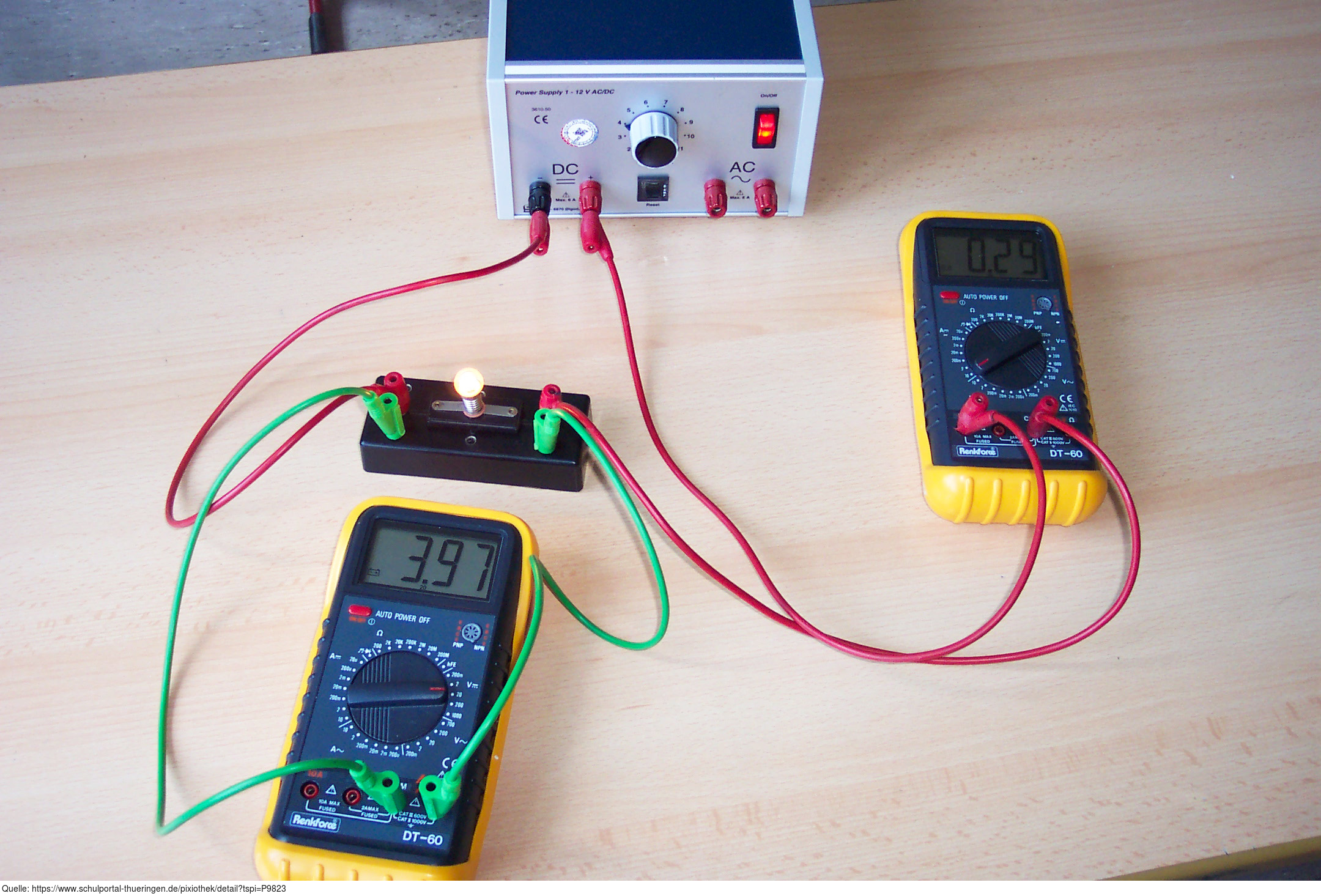 Das Foto gehört zur Serie "Elektrik". Es zeigt die Messung von Stromstärke und Spannung an einer Glühlampe mit digitalen Messgeräten. Das Bild ist unter CC0 lizenziert und kann somit frei verwendet werden.
