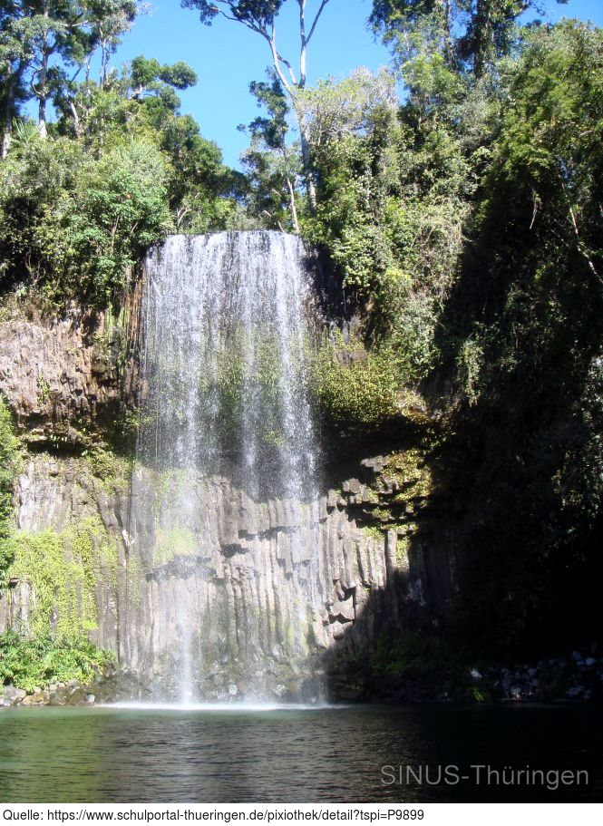 Zu sehen ist ein Wasserfall an einer geografischen Formation, die auch als Tafelland bezeichnet wird. Es gelten die Nutzungsbedingungen der Mediothek und Pixiothek.