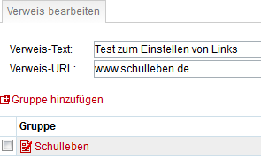 Unter dem Reiter "Links" können durch Angabe des Verweis-Textes und der zugehörigen URL = Internetadresse Links zu bestehenden Webseiten und Dokumenten im Web gesetzt werden.