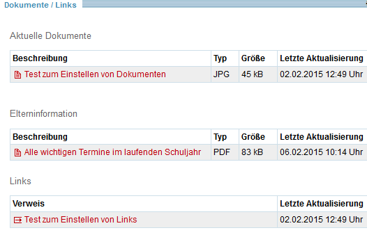 In diesem Bereich besteht die Möglichkeit, beliebige schulische Dokumente auf den Porträtseiten einzustellen. Gegenwärtig sind die Dateiformate pdf, doc, docx, rtf, txt, xls, xlsx, jpg und gif erlaubt. Die angebotenen Dokumente werden für alle Benutzer des Thüringer Schulportals als Link angezeigt und können heruntergeladen werden. Für jedes Dokument gilt eine Begrenzung der Dateigröße auf 5 MB.
