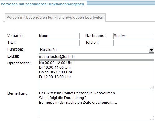 Dabei sind Vorname, Nachname und Funktion Pflichtfelder. Bei der Telefonnummer können Sie die Vorwahl durch ein beliebiges Zeichen von der Hauptnummer trennen (