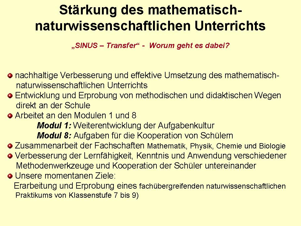 Erstbesuch am: 17.04.2007 Wiederholungsbesuch am: 08.01.2013 Auszeichnung mit Entwicklungsbonus am: 22.09.2014 Abschluss Zielvereinbarung am: 20.03.2013 Schwerpunkte unserer Schulentwicklung