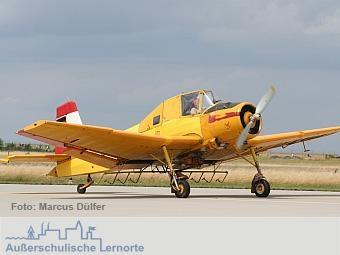 Im Außengelände und im Ausstellungsbereich zur Geschichte der Luftfahrt können die Schüler mit Hilfe von Schautafeln, einem Modell und einer originalen Let Z-37 die Entwicklung des Agrarfluges in Deutschland nachvollziehen. Dazu sind unterschiedliche Aufgabenstellungen möglich, die im Punkt "Inhalt" beschrieben sind.